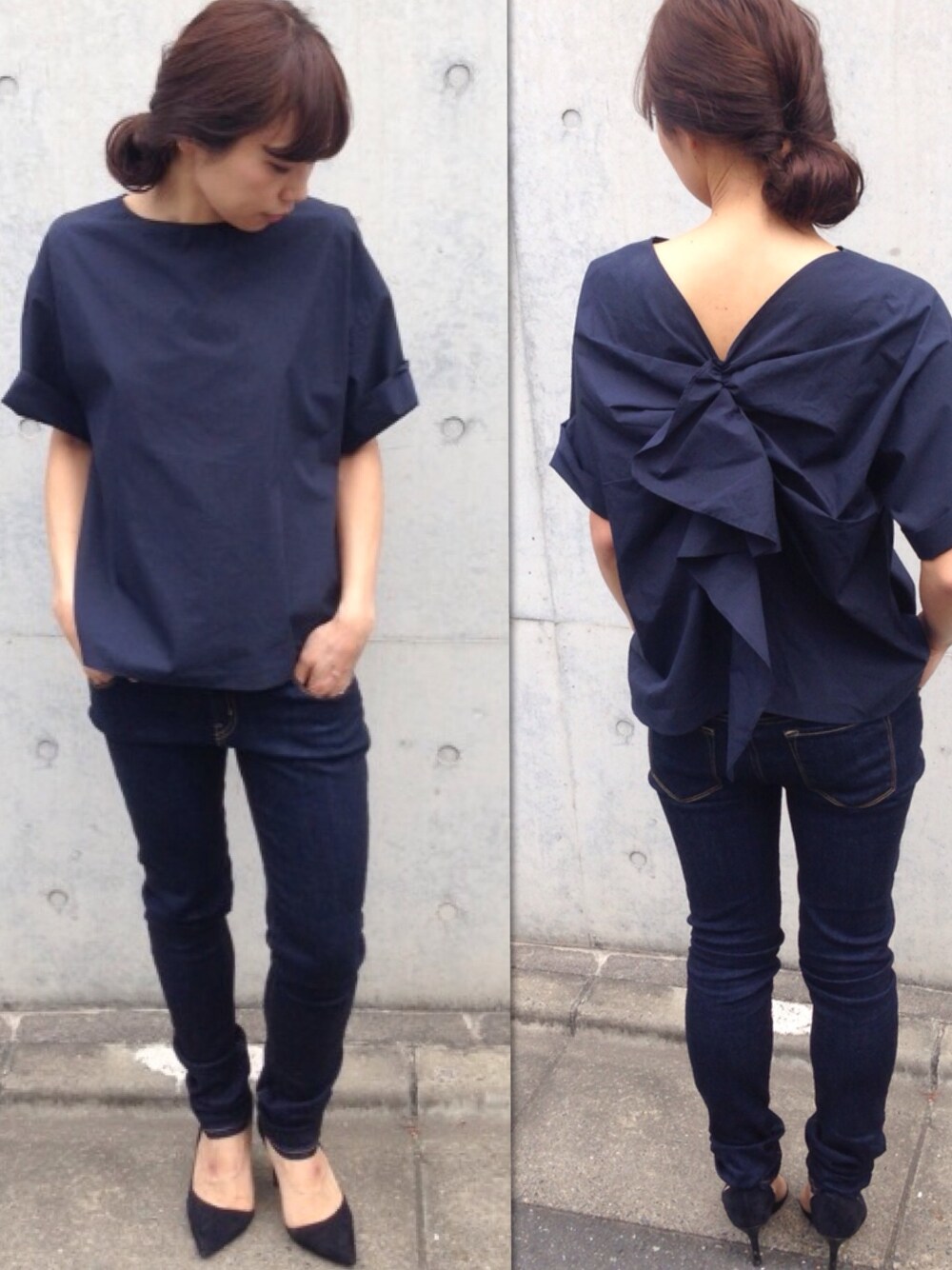 バックフリルがポイントのブラウスですが、実はフロントのシルエットもお気に入りです。一見シンプルですが、シルエットがとてもきれいで、丈感も絶妙。袖を少し折り返して着るのがおすすめ。今日は定番のスキニ―デニムと合わせて、カジュアルダウン。