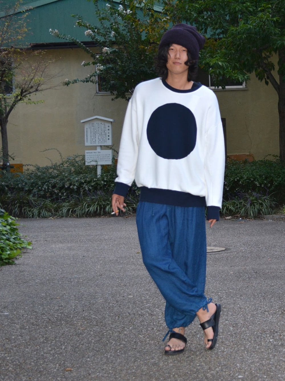 少し涼しくなってきたので、 秋スタイル。 ボリュームのある帽子と、 ゆったり日の丸スウェット、 ワイドパンツのスタイル。