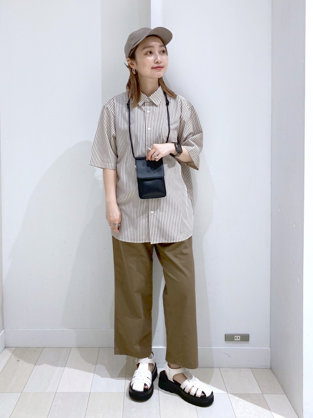 メンズアイテムスタイリング! ストライプシャツは接触冷感のお素材なので 涼しく着られるアイテムです! ボタンはあえて上まで止めて メンズライクな着こなしにしました! パンツはリネン素材で柔らかく ストレートのシルエットで程よくゆったり着られます! ウェストは紐で調節ができますよ♪