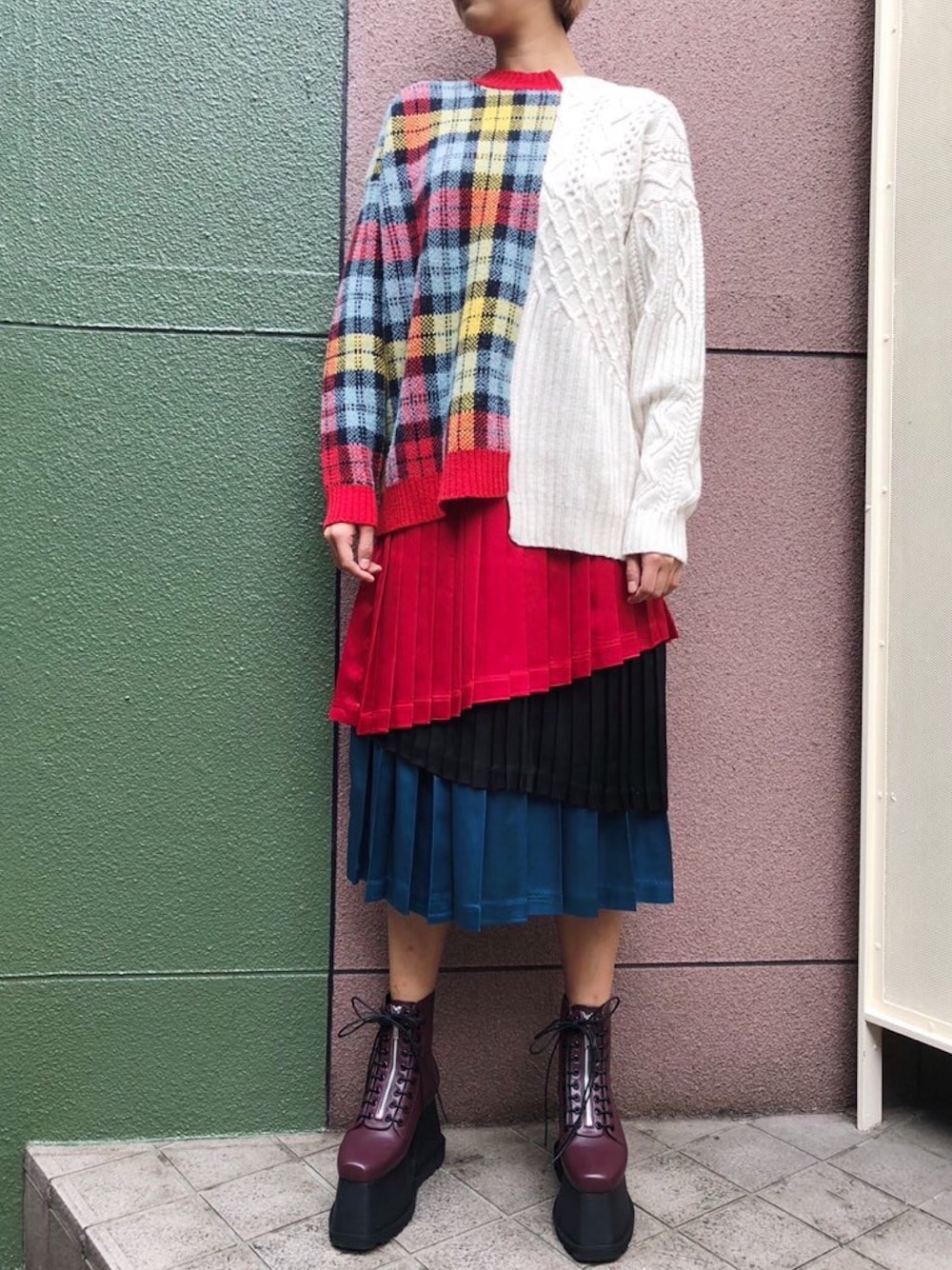 <RED COORDINATE> ●Half&Harf Knit Top ●Satin Mix Pleats Skirt