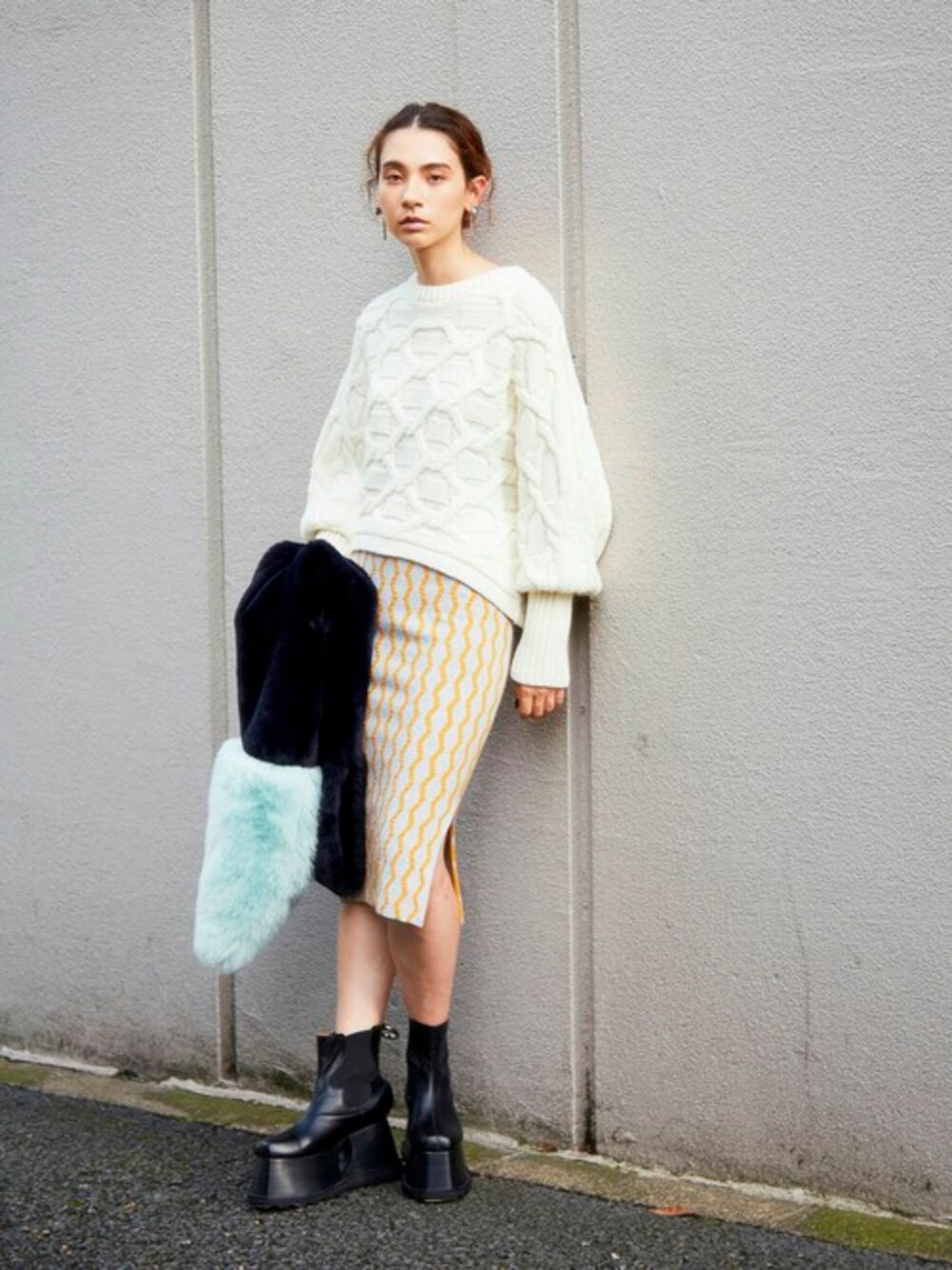 PAMEO POSEのニット/セーター「MUTTON SLEEVE KNIT TOP」を使ったコーディネート