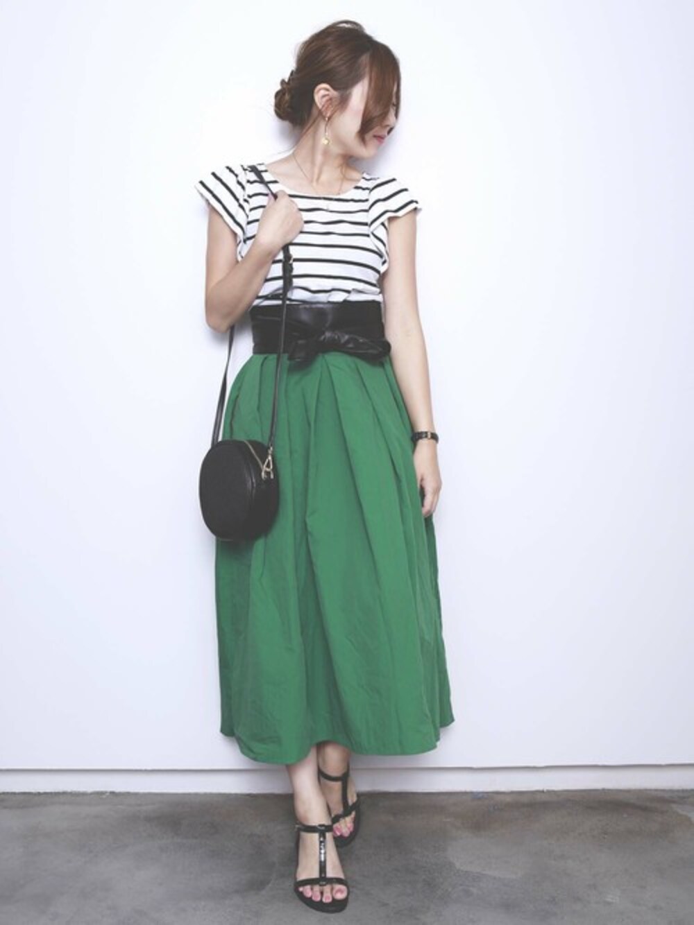 ボーダーのフレンチスリーブに、目を惹く鮮やかなグリーンのフレアスカートがさわやかで夏らしいコーデ♡ 海デートにおすすめです♪ 公式Instagramでは#プレクロで ステキなコーディネートを募集中♪