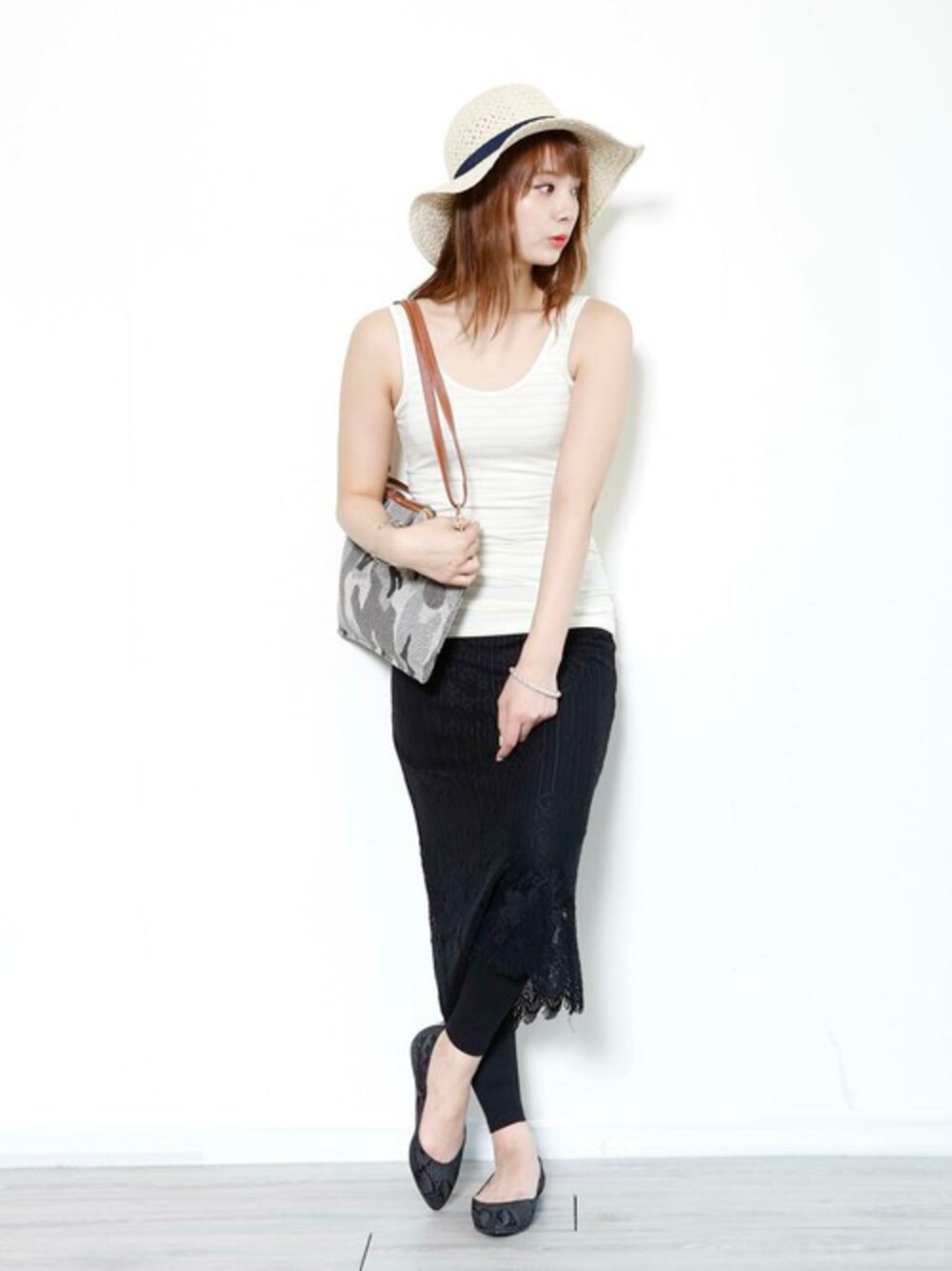 淡いカラーのボーダーのタンクトップに、今年トレンドの中が透けるタイプのレーススカートでかっこ可愛いスタイリングに仕上げました☆ つば広ハットとメタリックのブレスレットでより爽やかに演出! レースの甘さにカモフラージュ柄のクラッチバッグとパイソン柄のパンプスをチョイスすることにより大人可愛い印象に…♪