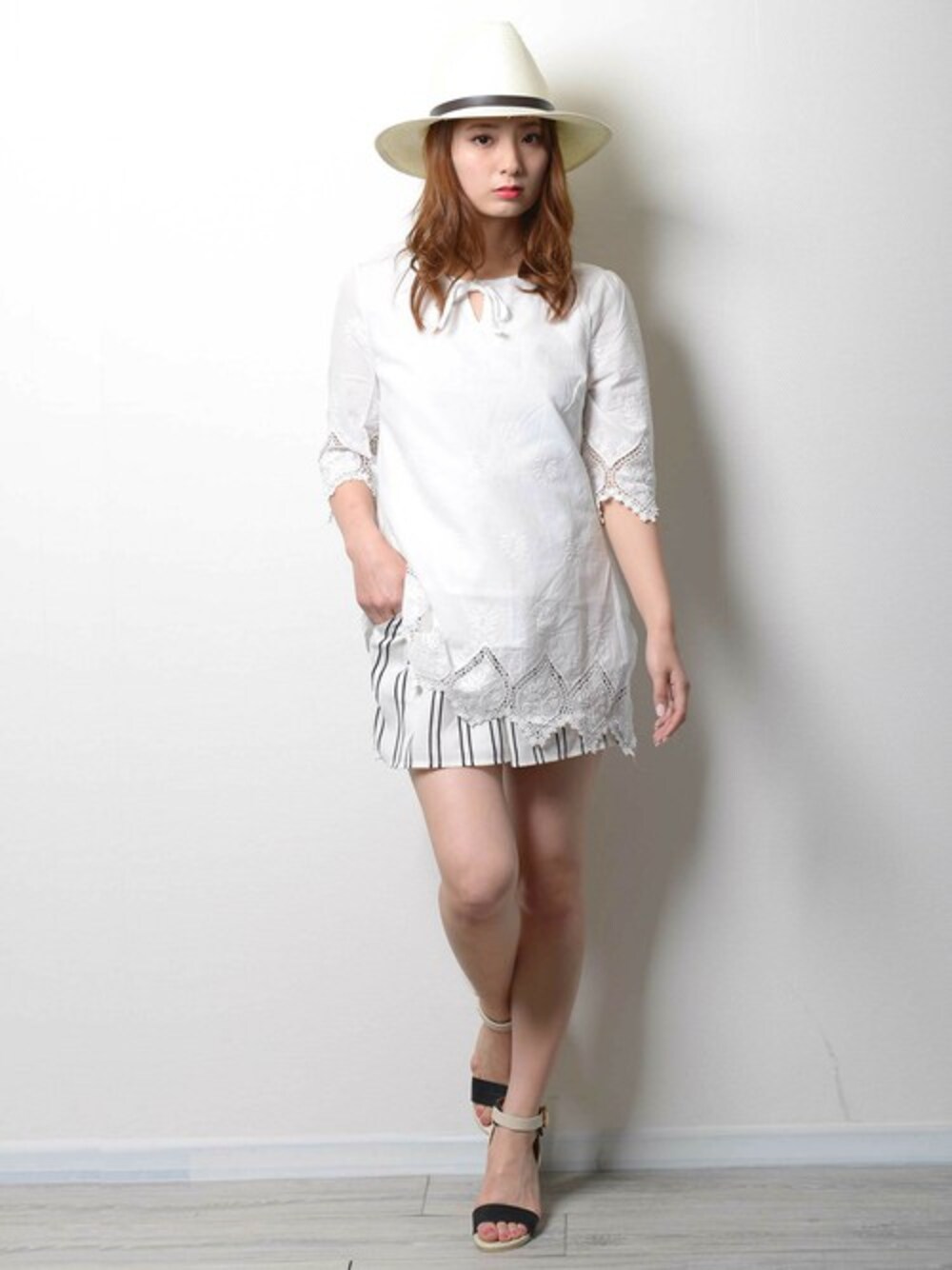 青空満点な日には爽やかに白を着たいですよね♪ 日差しも強くなってきたしそろそろストローハットは必需品になってきました! ホワイトコーデにところどころ黒のラインで引き締めてカジュアルさを出して着ると可愛いく仕上がります☆