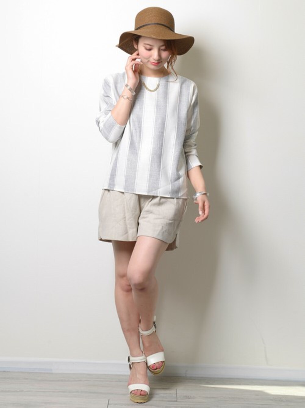 グレーのストライプとトップスにベージュを合わせた全体的に淡い色でまとめたカジュアルでありながらも どこかシックで大人っぽいコーデに仕上げました☆ 足元に真っ白のサンダルを合わせることにより、単調にならずぼやけない印象に・・・♪