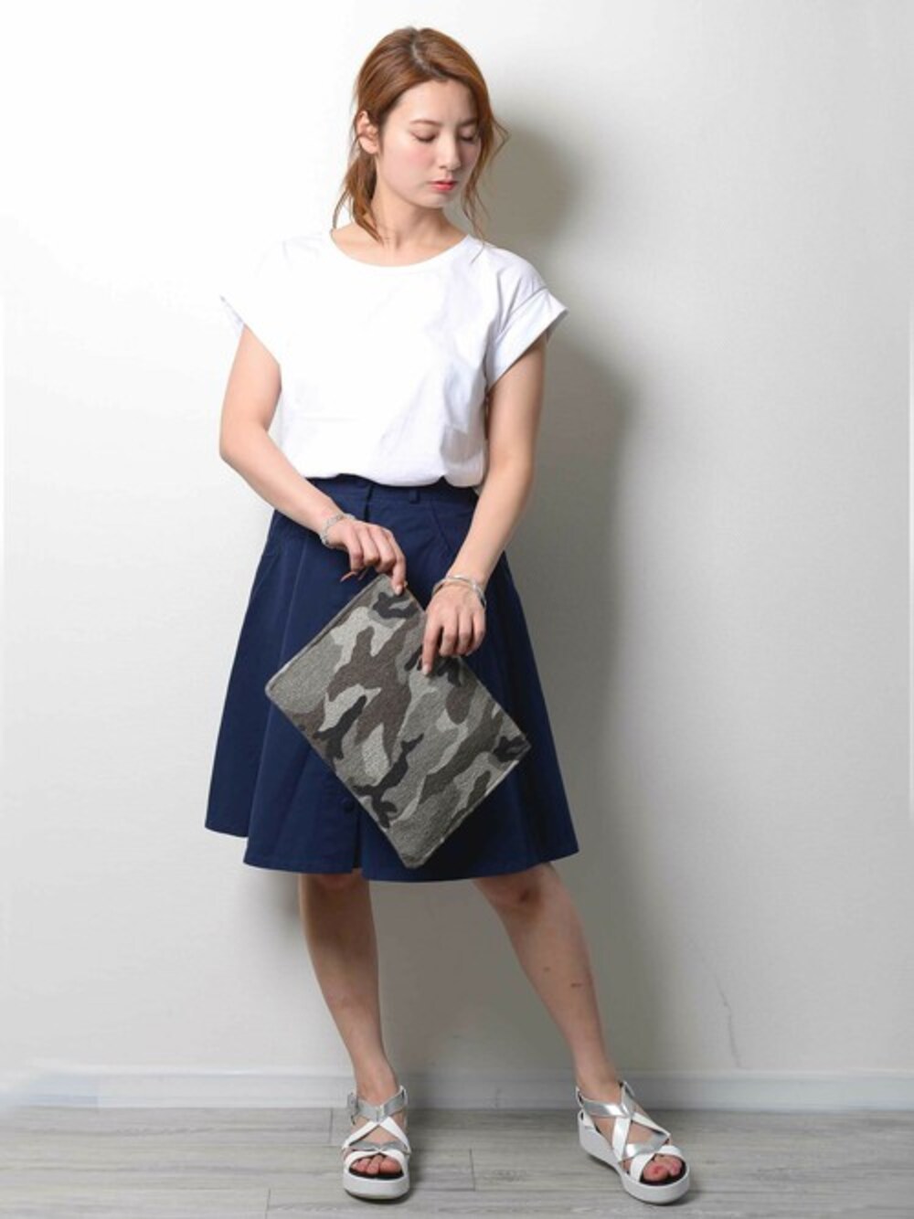 シンプルでありながらもクラッチのカモフラージュ柄で引き締めたコーディネート☆ トップスはふんわりとした生地感たのでべたつかず、真夏の今の季節にピッタリ! スカートもフレアで膝丈なので暑苦しくなくはいて頂けます♪ シルバーのフラットサンダルでセールショッピングへ出かけましょう♪