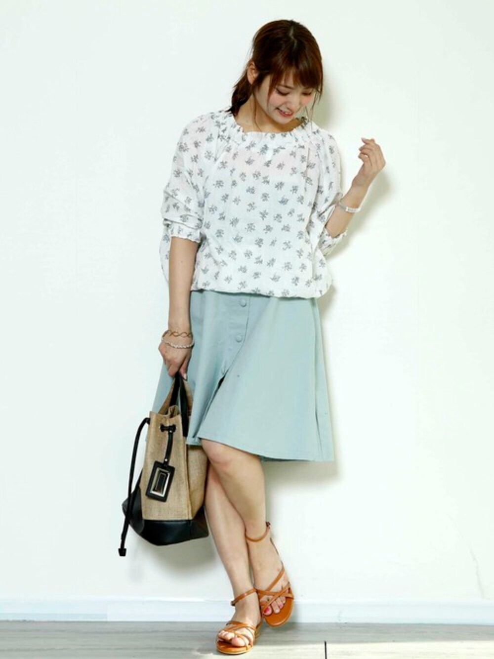 夏らしい花柄ブラウスにミントカラーのスカートが爽やかで可愛いコーデ! リネンのバッグで一層夏らしさを演出♪ 毎日暑いけど水族館、デートや、女子会などで暑さをふっとばしましょう☆