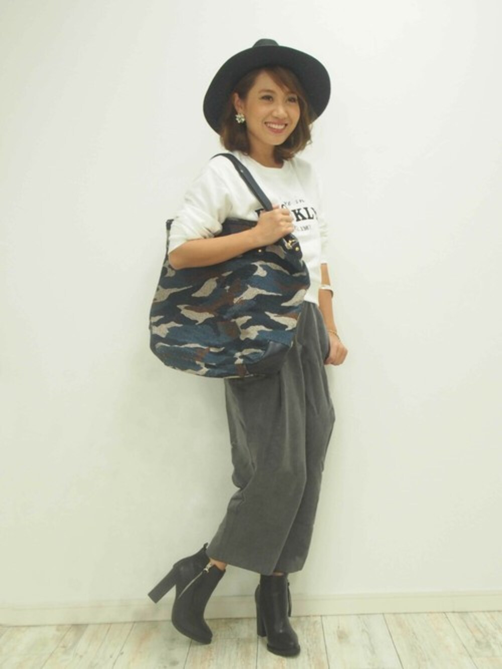 8月ももうすぐ終盤! そろそろ秋コーデを考えたい時期ですね♪ シンプルなロゴが入った丈が短めのスウェットに、ワイドパンツでスッキリ足長スタイル♪ 秋色のカモフラージュ柄のトートバッグをアクセントに大人カジュアルにしあげました!