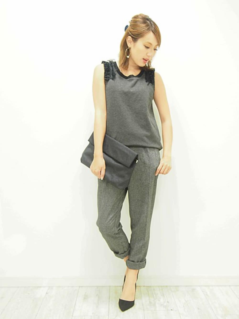 台風も去っていきまた暑い日が来ましたね! 涼しくなってきてもまだまだノースリーブが手放せない! モノトーンでコーディネートしているので、カジュアルでもきれい目に仕上がり上品な印象に☆ 女子会などによさそうですね!
