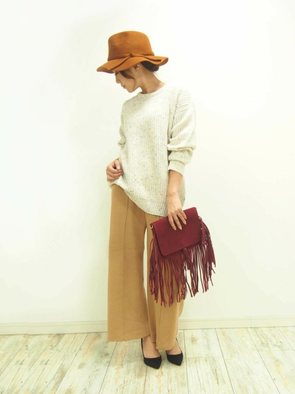 ブラウン系コーデに、アクセントとしてワインレッドのフリンジバッグを合わせた秋の大人コーディネートです♪ ゆったりとしたシルエットが今年らしく、ハットをプラスするだけで旬のコーディネートが簡単に出来ちゃいます! 細いリボンが上品なフェルトハットは、女性らしい雰囲気が出てこれからの季節に活躍しそうです! 収縮性のあるニットワイドパンツは、ラクに着れてウエストゴムもしっかりとしていてました。着用しても形がキレイで履きやすかったです! 普段23cmを履いていますが、ポインテッドパンプスなので足幅は少し狭めな感じもしますが、23㎝でちょうど良かったです♪シンプルでどんなコーディネートにも合わせやすいと思います。