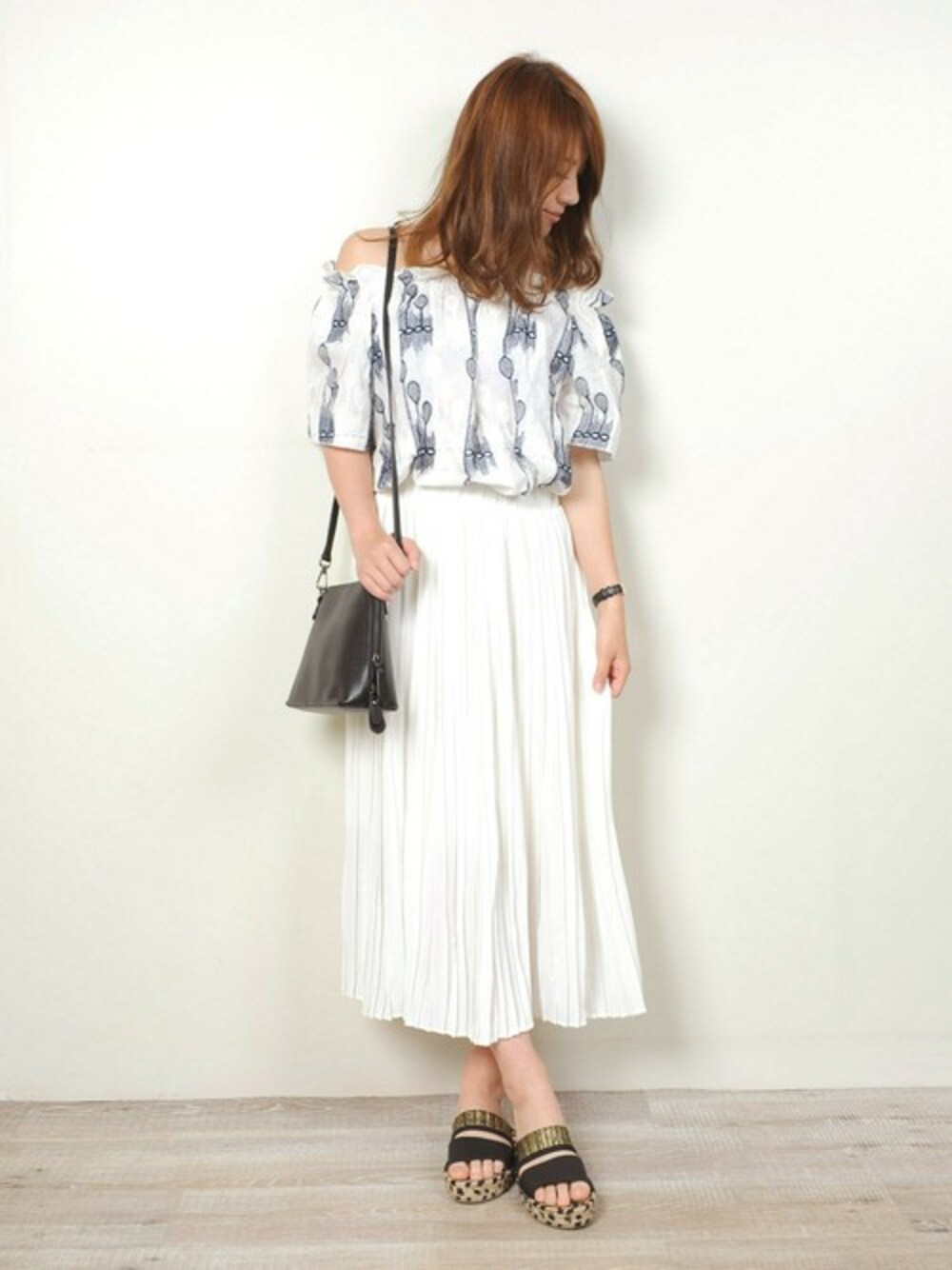 つくし柄の大人可愛いオフショルダーとプリーツスカートで女の子らしくコーディネート。 小物はブラックで合わせて大人っぽさも忘れずに。 プリーツスカートはウエストゴムになっていてSサイズの私でも丁度良く、楽ちんなのに上品さもバッチリ演出してくれるので今シーズン活躍間違いなしのアイテムです♪