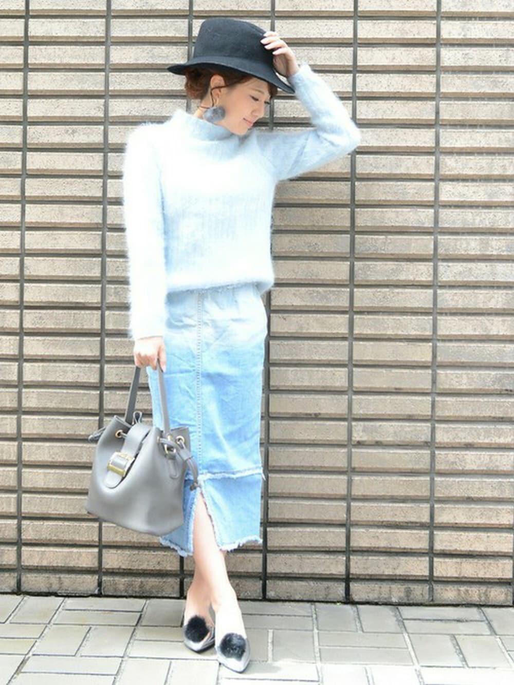 モヘアニットにデニムスカートを合わせて大人カジュアルに。 小物はモノトーンでまとめて統一感を◎ instagram⇨@plain_clothing #オトナカジュアル #シンプルコーデ #モヘアニット #スカートスタイル #ハット #ファー #巾着バッグ