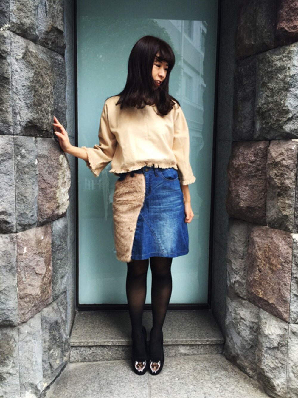 ななこ☻(ライチ)のデニムスカート「La premiere ファー×ストレッチデニムタイトスカート」を使ったコーディネート