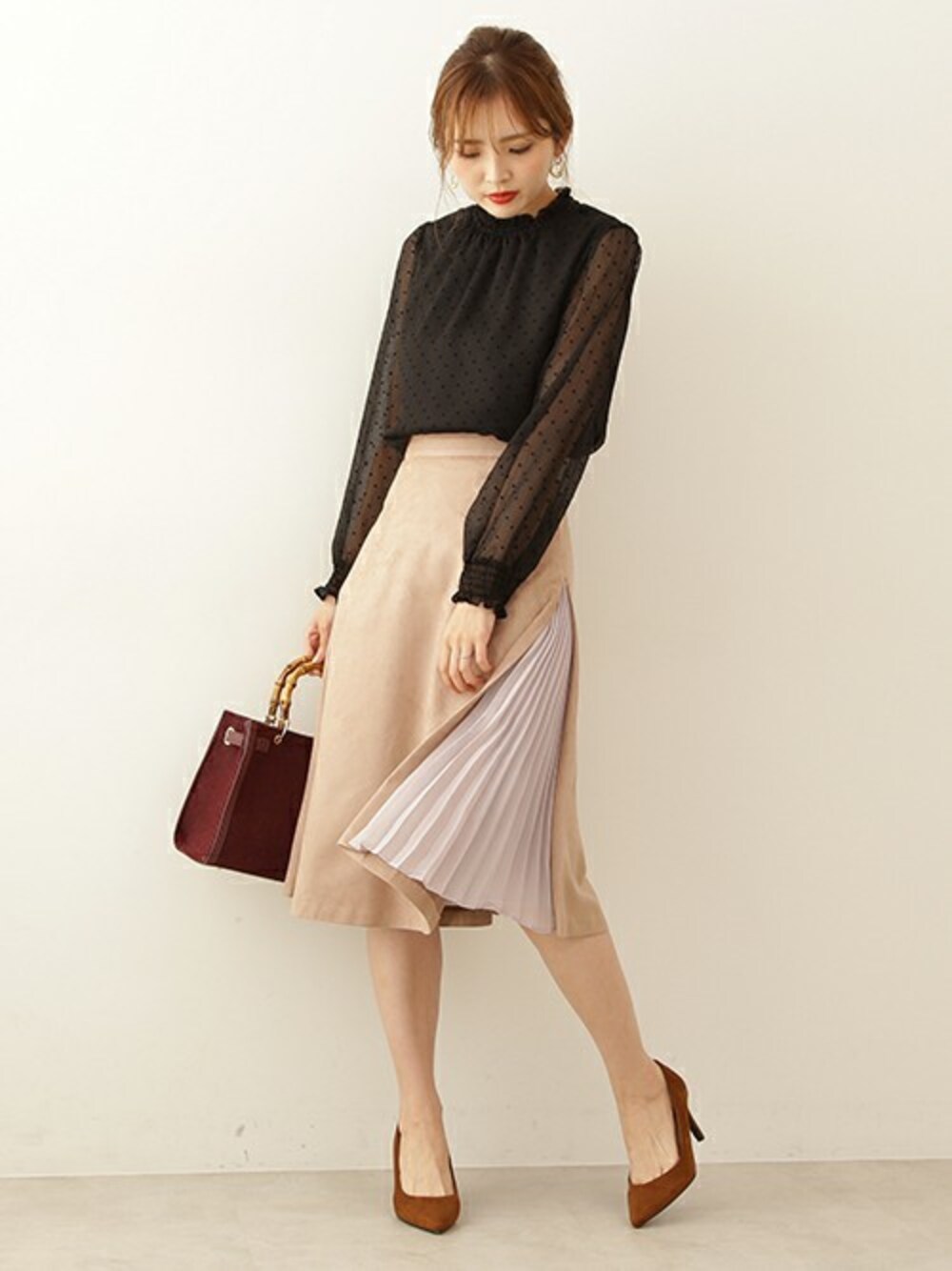 この秋注目のクラシカルスタイル! 程よいシアー感が女性らしさを引き立ててくれる。 小物でカラーを取り入れるのがポイント♪
