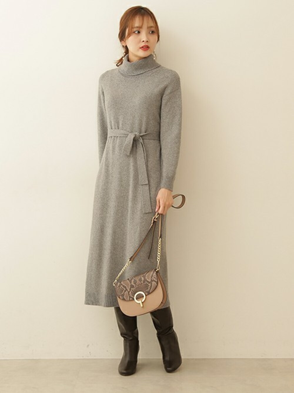 休日のお出かけスタイル。 ざっくりニットワンピで1枚完結スタイル。 デニムパンツやリブニットなどを合わせてカジュアルダウンしたり、ロングコートを合わせてきれいめにしたり、 合わせるアイテムで様々な着こなしが楽しめるアイテムです。