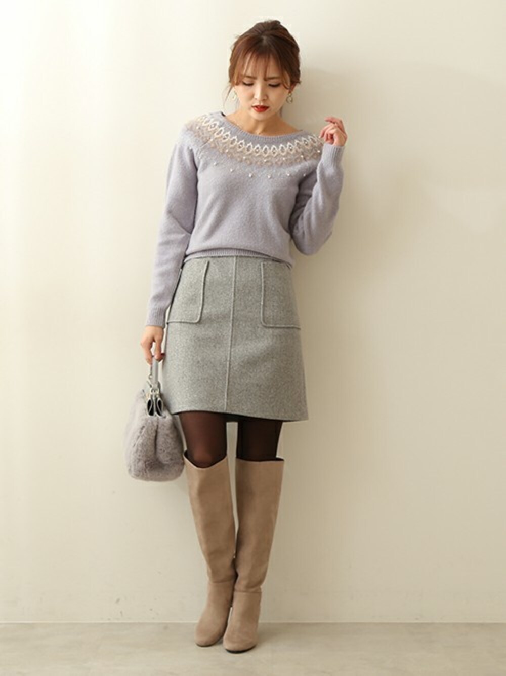 ほっこりしがちなノルディック柄ニットはミニスカートと合わせて大人っぽく着こなすのがポイント! 足を出すのに抵抗がある方はタイツ+ロングブーツで防寒もできるのでおすすめです。