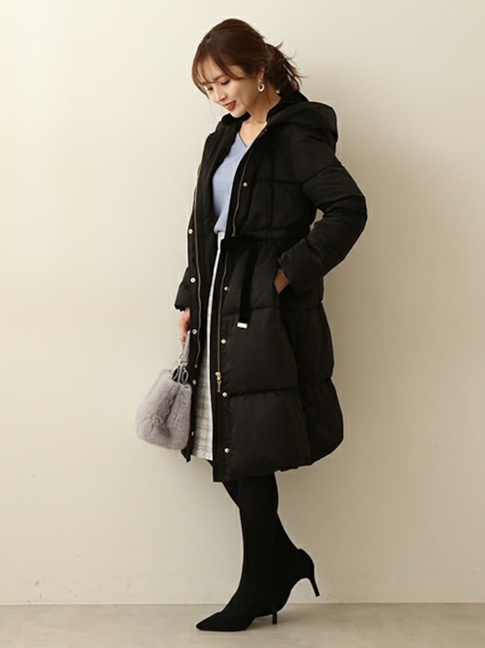 黒ダウンコートで冬のモテ女子コーデ。 フェミニンなスカートに合わせて冬のデート♪ ウエストが絞れるので太って見えがちなダウンコートもスタイル良く着れるのが嬉しいポイント!