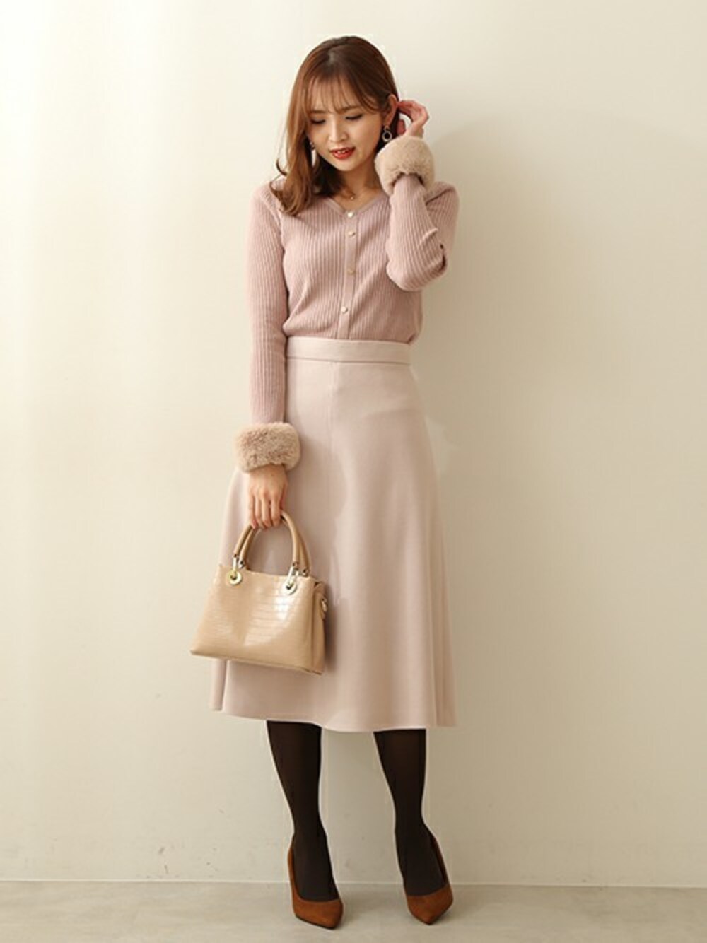 ピンク×ピンクの王道モテコーデ。 上品な淡いピンクがやりすぎない大人フェミニンな印象に。 袖のファーが可愛さを引き立ててくれる。
