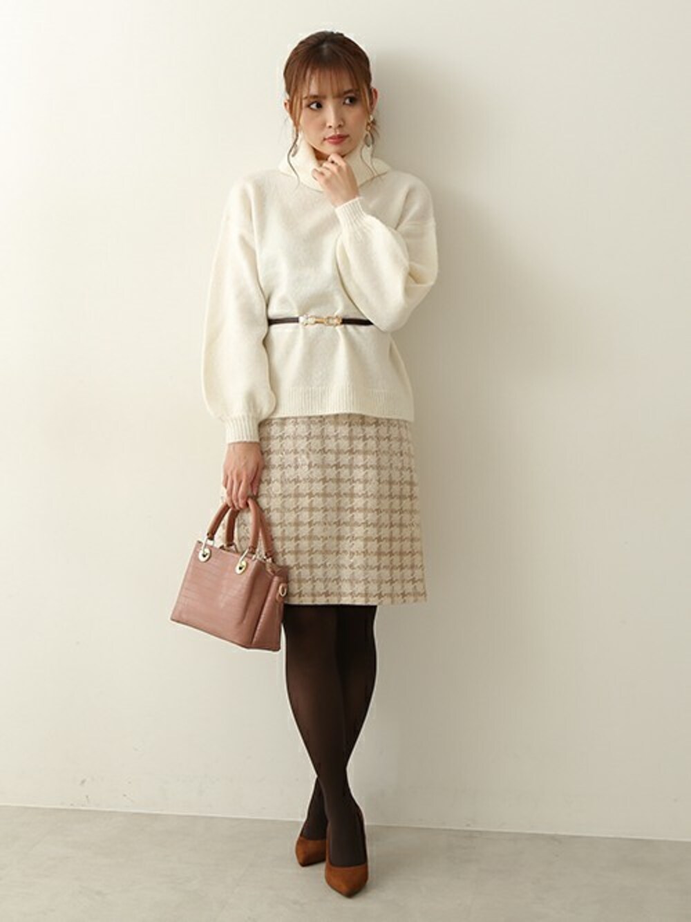ざっくりしたタートルネックから出る顔は、包まれてうもれてる感じが可愛い、冬に着たくなるアイテム。 ゆるっと着るのもいいですが、今年はベルトでウエストマークするのがおすすめ! スタイルがよく見えて、さらに、こなれ感もあるのでぜひチャレンジしてほしいスタイリングです。