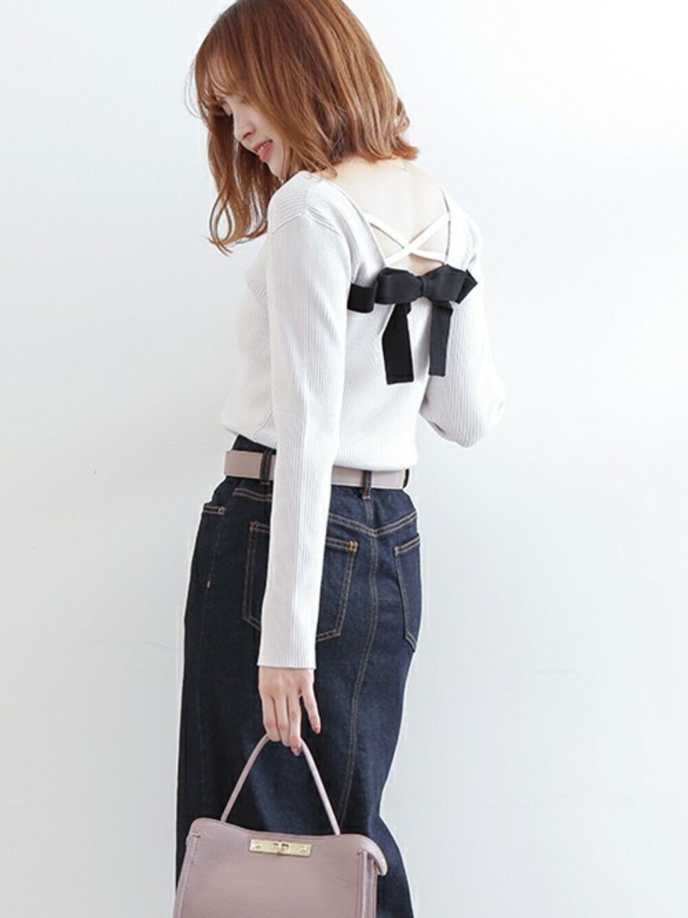 バックスタイルの抜かりなく! 大きく開いた背中が色気を感じさせながら、リボンでフェミニンな雰囲気を演出。 デニムと合わせにベストなアイテムです。