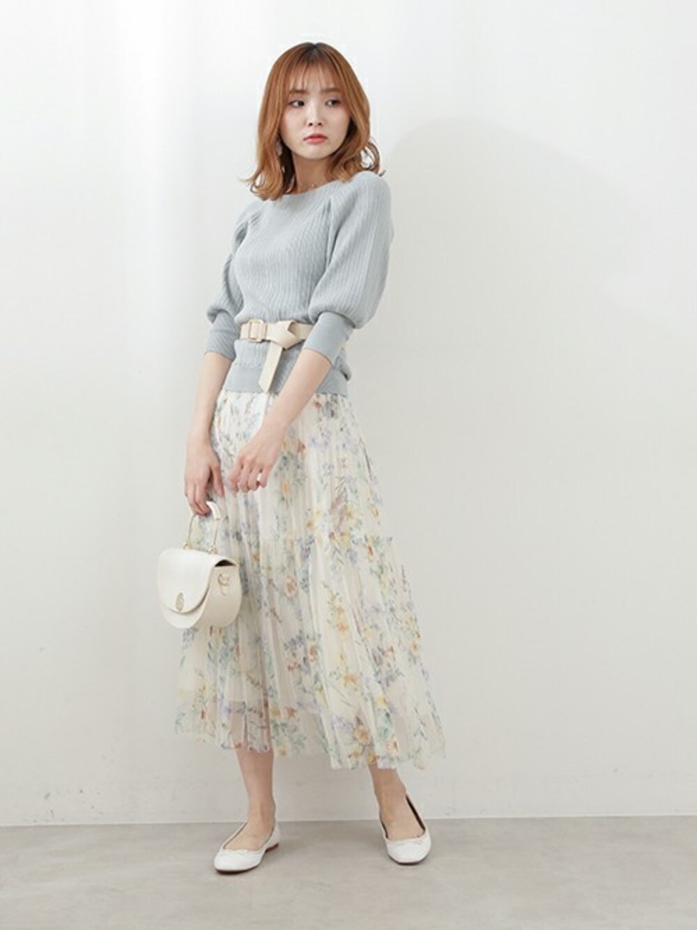 ミント×イエローの今旬注目カラー! プロポーションで大人気のボリュームスリーブニットもウエストにベルトを巻くだけ新鮮+おしゃれコーデに。
