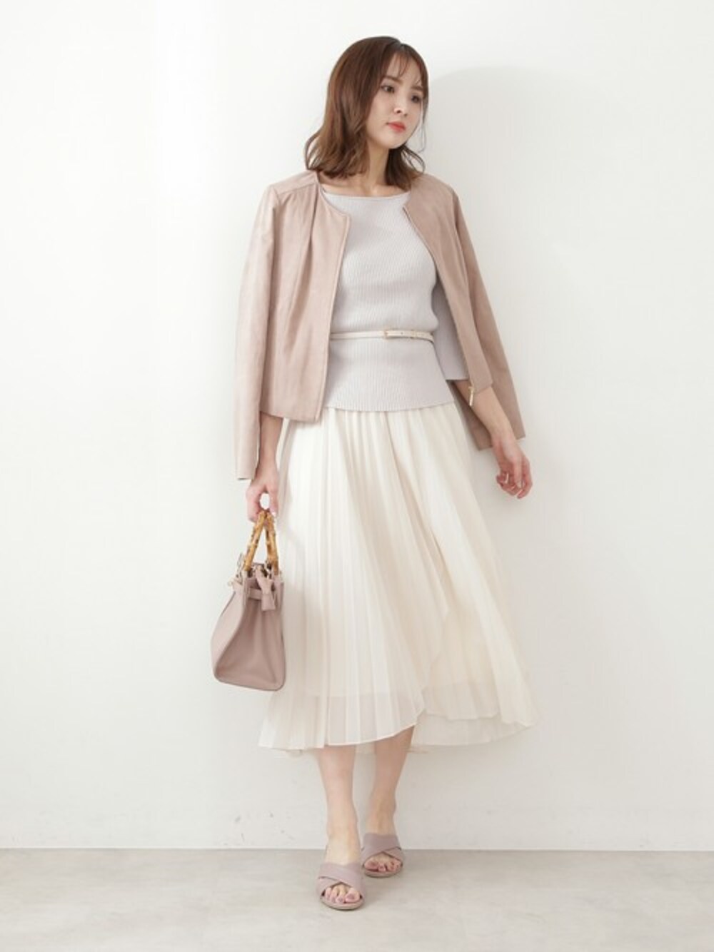 かっちりした印象のフェイクスエードブルゾンはふらりとゆれるプリーツスカートと合わせてフェミニンに仕上げるのがおすすめ。 いつものニットにベルトでアクセントをプラスして今っぽく更新。