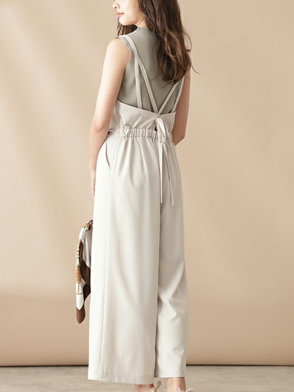 カジュアルになりがちなオールインワンもきれいめスタイルに。 スモーキーカラーを合わせてきれいに仕上げるのがポイント!