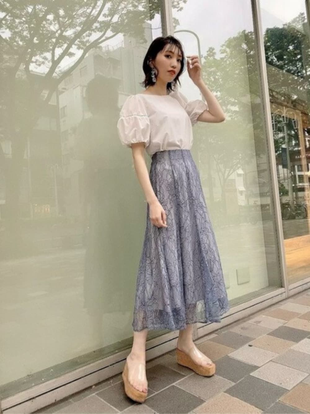 着丈もレース感も今っぽい♡高みえするブルーがお洒落なレーススカート。 今年らしいボリュームのあるブラウスやクリア小物と合わせて、 大人カジュアルに着こなすのがおすすめです!