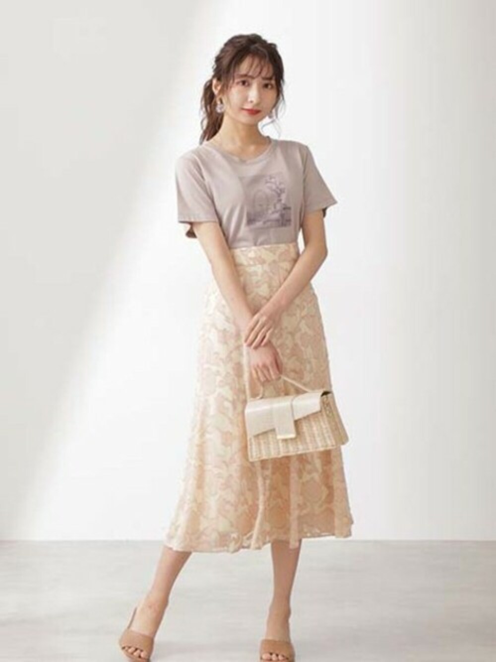フォトプリントが大人可愛いTシャツ♥ プロポオリジナルのニュアンスカラーも素敵です。 スタンダードなシルエット&サイズ感はスカートスタイリングに似合います。