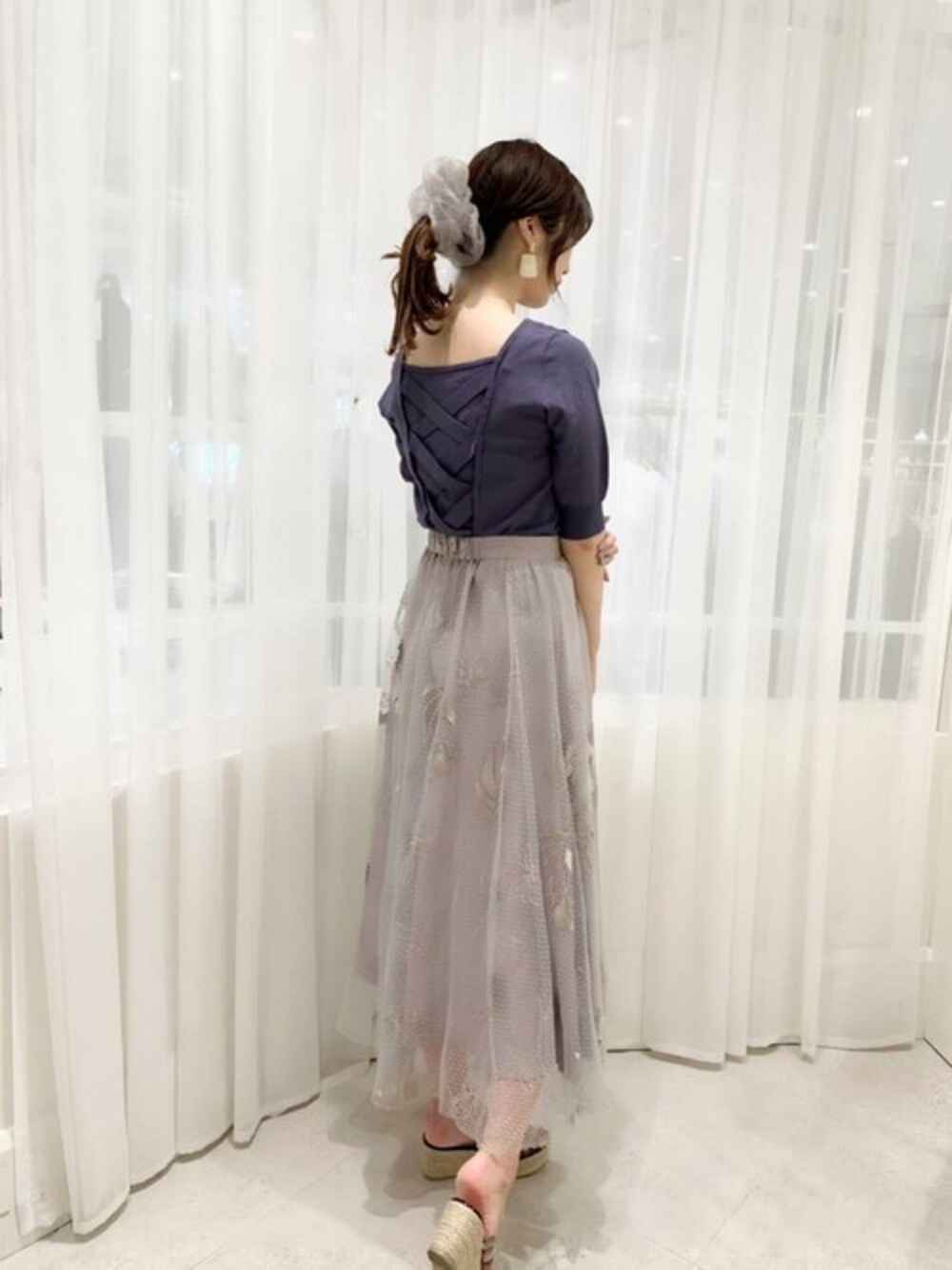 トレンドのニュアンスカラーのチュールスカートが主役のコーデです♡ トップスは前から見るとシンプルですが後ろがレースアップになっているので 無地などのシンプルなスカート合わせも◎◎
