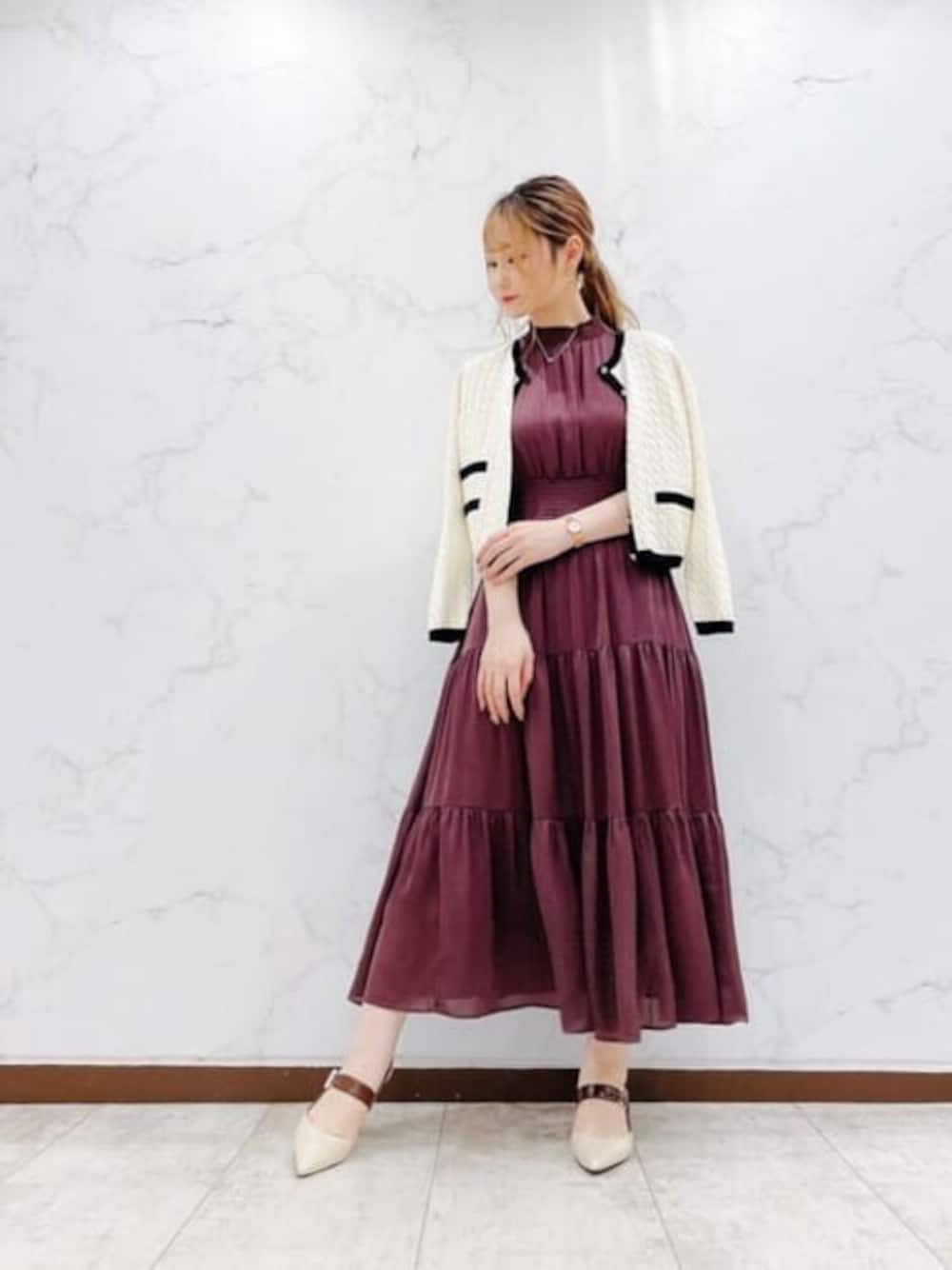 光沢感のある生地が高見えする綺麗目ワンピース♡ ノースリーブなので秋にはカーデ合わせがぴったりです! バイカラーのケーブルカーデは1枚羽織るだけでコーデを上品見えさせてくれます♪