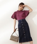 フロント釦デザインやステッチが縦ラインをすっきり見せてくれるデニムスカートです! ウエストの後ろにゴムが施されているので、 タイトシルエットでも着心地良く着て頂けます! クラシカルムードのあるバイカラーカーデも、 デニムスカート合わせならフェミニンカジュアルな印象に♡ 大人クラシカルなモノトーンで仕上げました!
