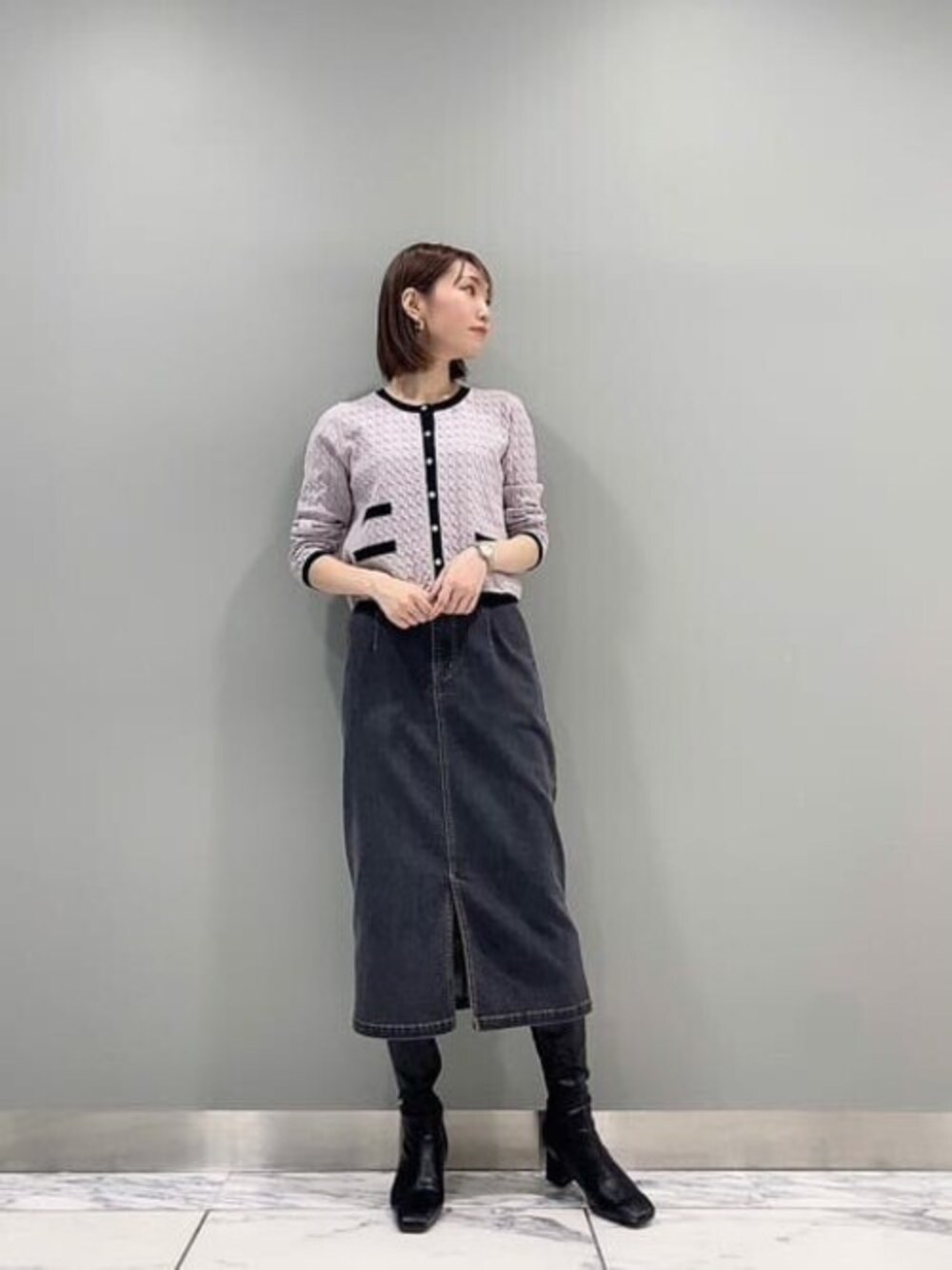 バイカラーの配色が羽織としても釦を留めて着ても映える♡ケーブル編みのカーディガンです! 今年らしいクラシカルなデザインなので、一枚あると着回しに重宝します! バイカラーの配色に馴染むタイトデニムスカートとブラックのブーツ合わせなら、 縦ラインをよりすっきり見せ大人っぽい仕上がりになります!