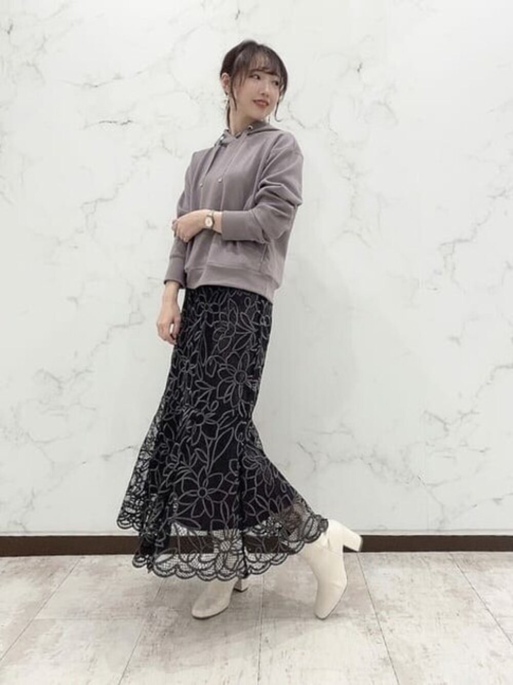 つるっとした素材感が着心地の良いコンパクトパーカーは着丈が短くコーデのバランスが取りやすいです◎ ボトムに合わせたレーススカートはマーメイドの揺れ感が可愛い♡ カジュアルにもきれいめにも着回せる一枚です♩