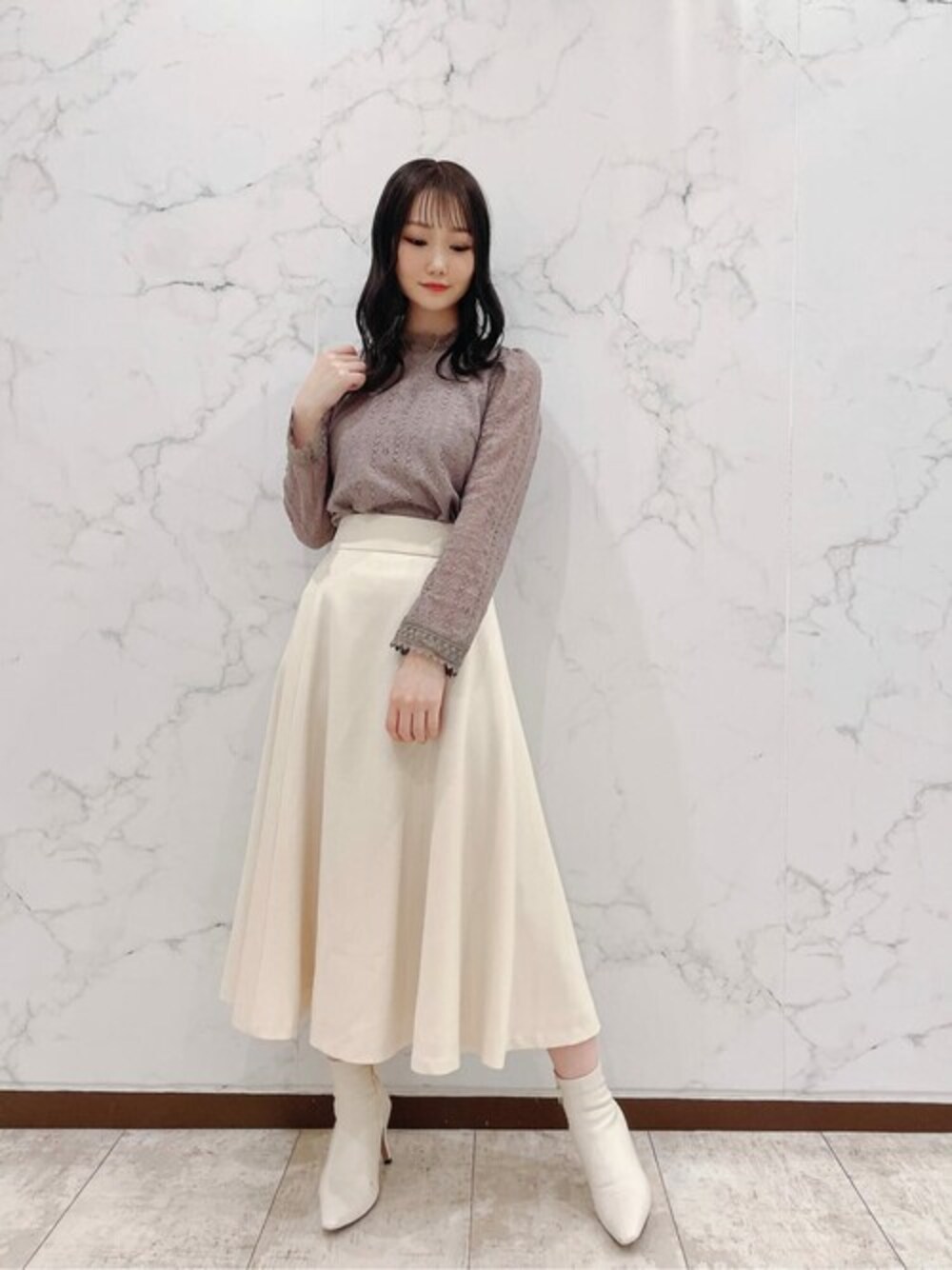 毎回大人気のレースブラウス、今回は大人可愛い上品レースで登場♡ 袖と首元のスカラップレースが高見えポイント! シンプルな無地スカートは動いたときの揺れ感が可愛い1枚♡ 程よいボリューム感でオンオフ兼用で着回しできるスカートです!!