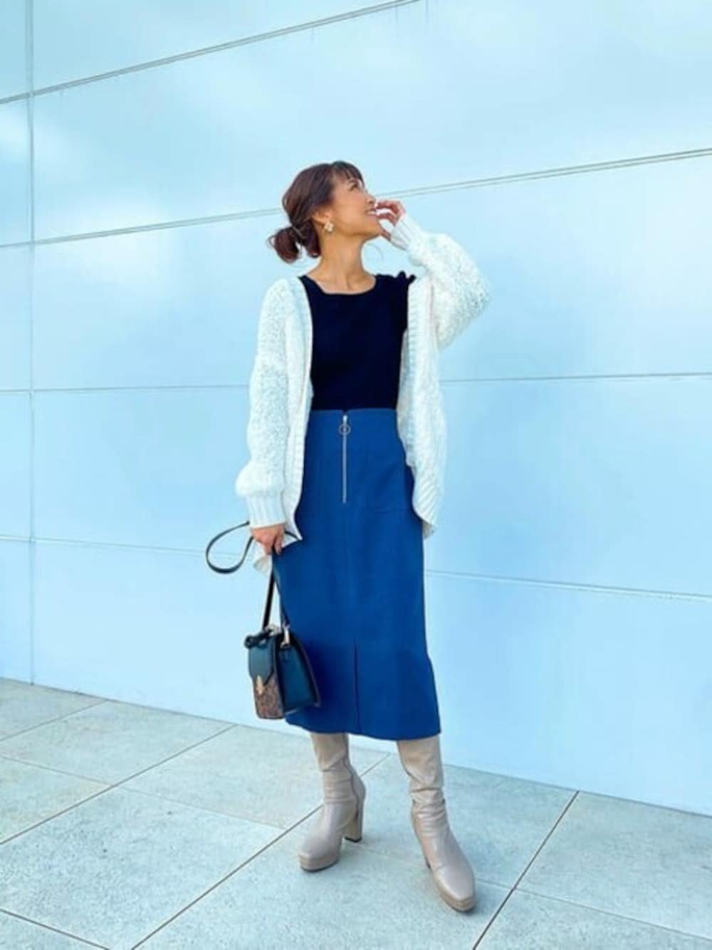 色鮮やかなブルーがオシャレ度UP間違いなしのキレイめコーデ♡ シンプルなコーデにすることでよりオシャレに+上品に仕上がります♪ 小物でトレンドの柄物を入れると、コーデが引き締まりますよ♪ アウターはあえてのもこもこカーデで、抜け感と女性らしいフェミニンさも忘れずに♡