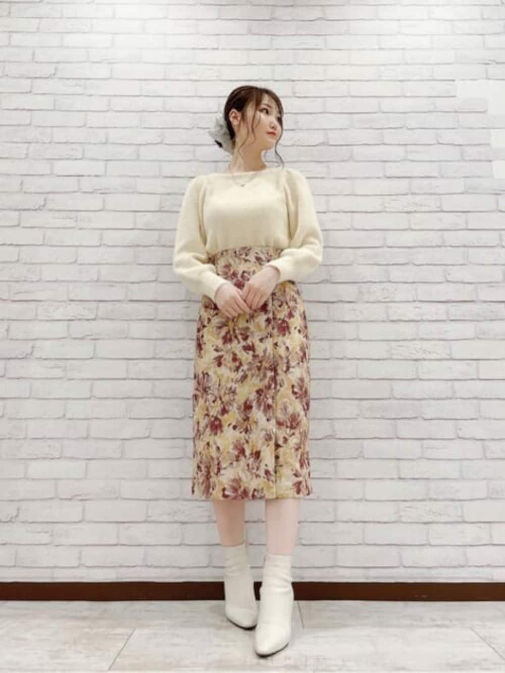 柔らかいイエロー味のあるニットは、前後2wayで着用できます! シンプルなボトムスの時は、前にパールを持ってきて頂くとコーデのワンポイントに♡ 花柄のスカートはジャガード生地が高見え! 着丈も膝下丈で綺麗目にお使いいただけるので通勤にも使いやすいアイテムです♪