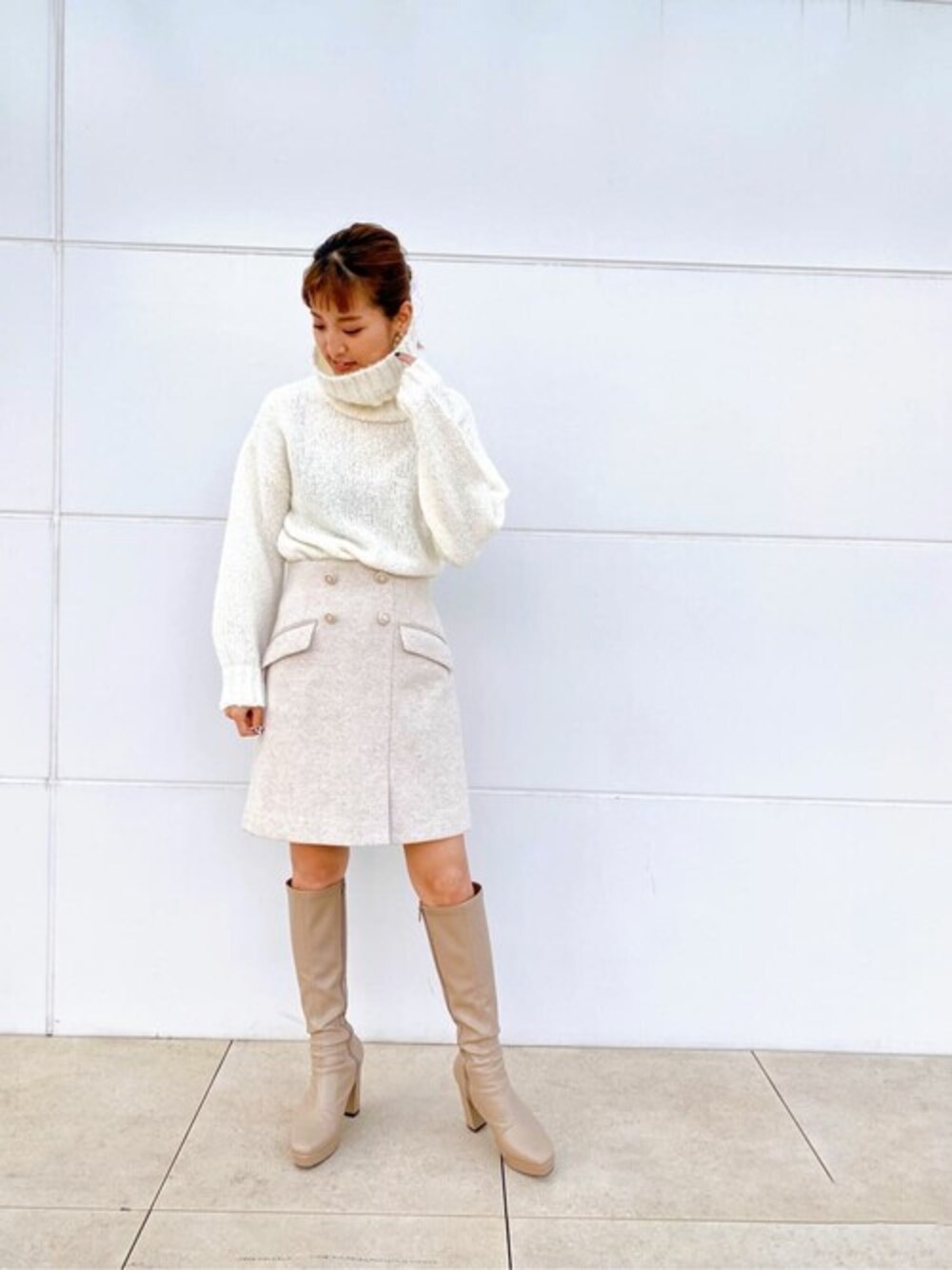今年らしいミニスカート×ボリュームニットコーデ♡ 台形のスカートは、足を綺麗に見せてくれます♪冬らしホワイト系で統一するとアウターも合わせやすく、清潔感もUP。 今期らしいロングブーツ合わせがオススメです♡