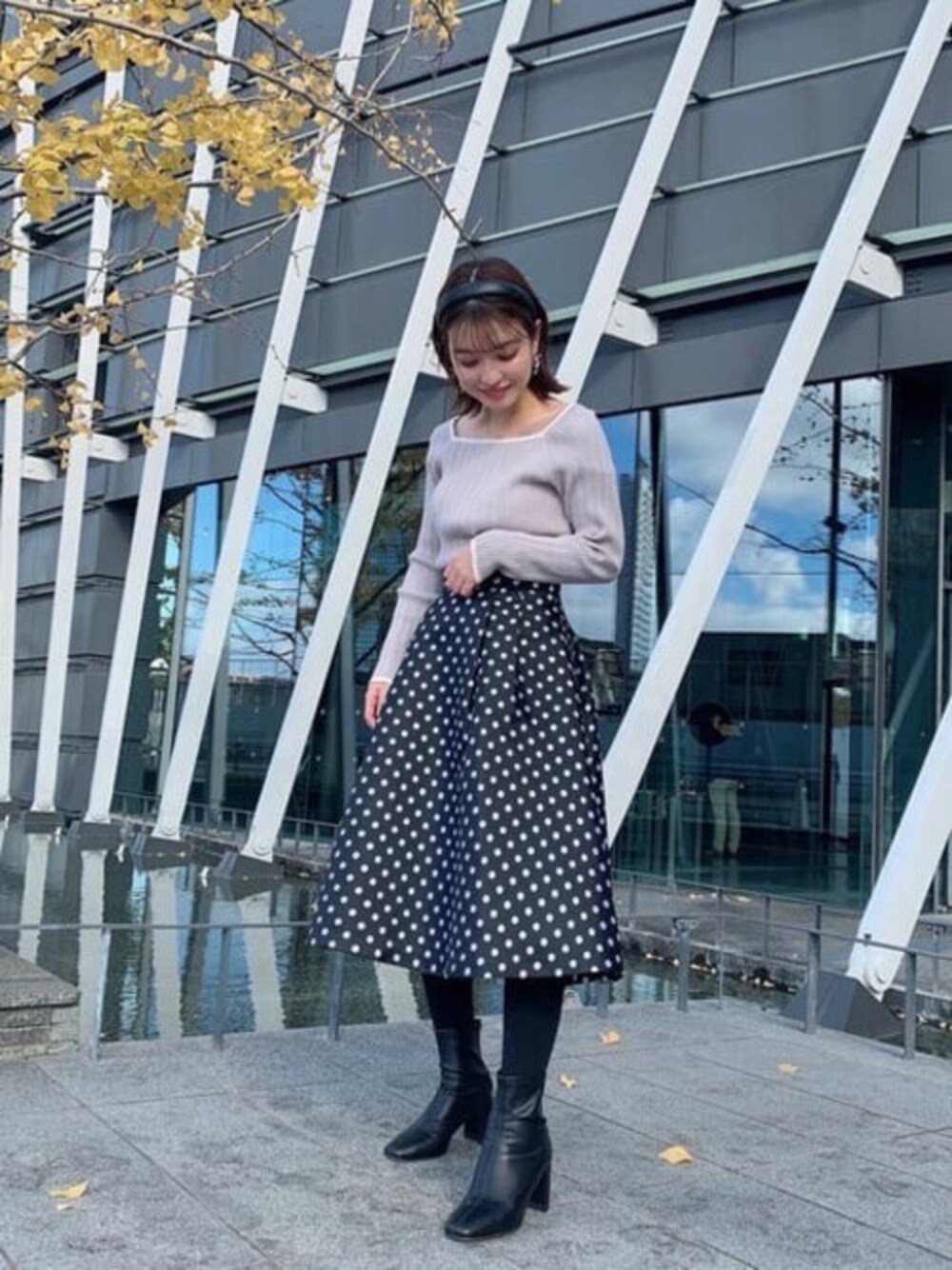 目を引く華やかなドットフレアスカートです! ボリューム感のあるフェミニンな雰囲気がでるスカートになっています! トップスはすっきり見えるリブニットでバランス良く見えます!