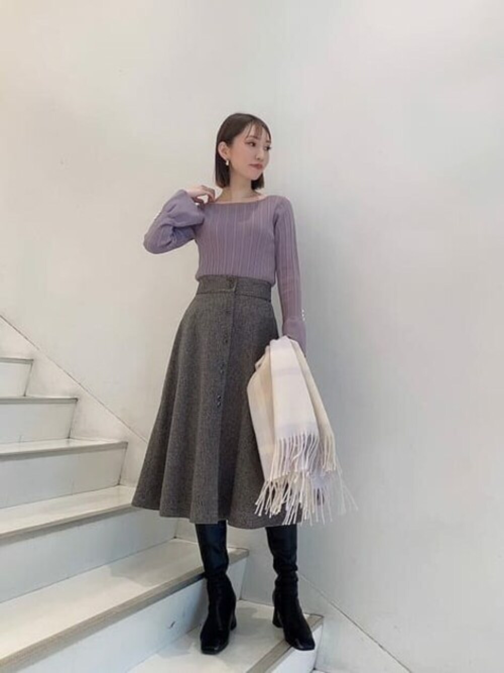 程よく広がるフレアスリーブと、袖口のパールがワンポイントで可愛いリブニットです! 透かし編みの入った柔らかい素材なので、体のラインを拾い過ぎず着心地のよい一枚◎ プロポ定番のラメツイードスカート合わせなら、甘くなりがちなラベンダーもキレイめな仕上がりに♡オンオフ共に着ていただけます!