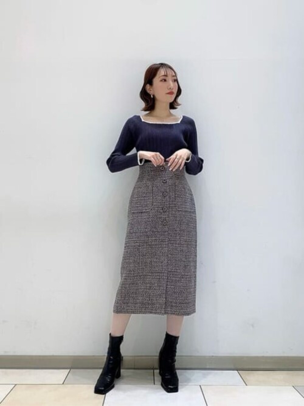 冬らしさ満載の華やかなツイードが上品なタイトスカートです! フロントの飾り釦が縦ラインをすっきり見せてくれるので、トップスはウエストインすることでよりスタイルUP効果にも◎ 気温がさらに下がり始めるこれからの時期は、ふんわりとした風合いが可愛いカーデを羽織ることで、より暖かみのある冬らしい印象に♡