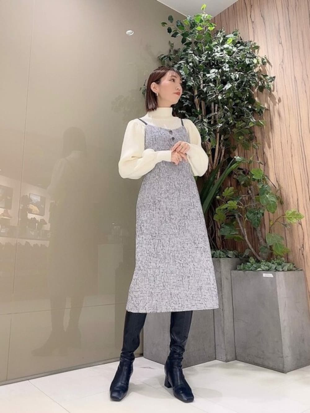 フロントボタンやタイトシルエットが縦ラインを細見えしてくれる♡ スプリングツイードが華やかなジャンパースカートです! ウエスト位置を高く見せてくれるハイウエストデザインなので、ボリュームのあるニットとも着太り感なく着て頂けます! 足元はブラックで締めることで、パステルカラーもメリハリのあるコーデに♡