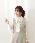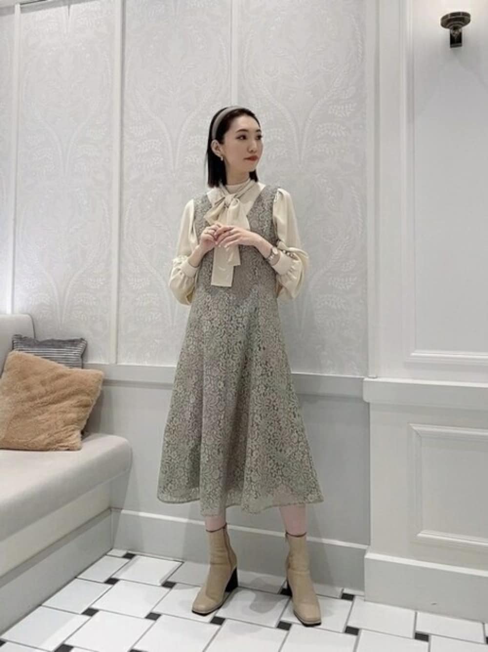 繊細なレースが高見えする♡グリーンの色味が春らしいジャンパースカートコーデです! 甘くなりすぎないくすみ感のあるカラーなので、ボウタイリボンのトップス合わせも相性◎ ウエストがくびれたシルエットなので、ボリュームのあるトップスとも着太り感なくスッキリ着て頂けます♪
