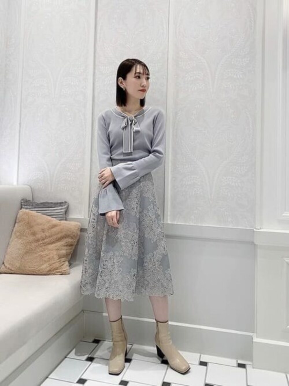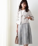 ダスティーブルーのワントーンで仕上げた綺麗めコーデです! 毎年人気のケミカルレーススカートは、ハリのある生地感と甘くなりすぎないカットワークレースにアップデートされ、さらに高見えする一枚に♡ トップスはブルー×ホワイトの配色やボウタイリボンが春らしいデザイン♪今すぐ着れる素材感も嬉しいポイント◎