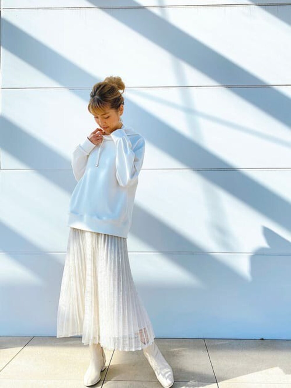 オールホワイトがおしゃれな春先取りのカジュアルコーデ♡ 程よいビッグシルエットのパーカーはコンパクトタイプと共に毎年大人気! 完売前の今が狙い時♪ プロポオリジナルのニュアンスカラーは全色おすすめ♡ ロング丈のSKと合わせるとバランスもとりやすく、トレンド感も◎