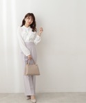【着用サイズ】トップス:M ボトムス:M 【普段サイズ】トップス:S ボトムス:XS~S グレージュ×ラベンダーの色合いが春らしいワントーン風コーデです! オンオフ万能に着回せるパンツは程よいフレアシルエットやセンタープレスの入ったデザインが、足周りのラインをしっかりカバーしてくれる美脚見えする一枚♪ ボウタイデザインもパンツ合わせなら大人っぽく仕上がります!