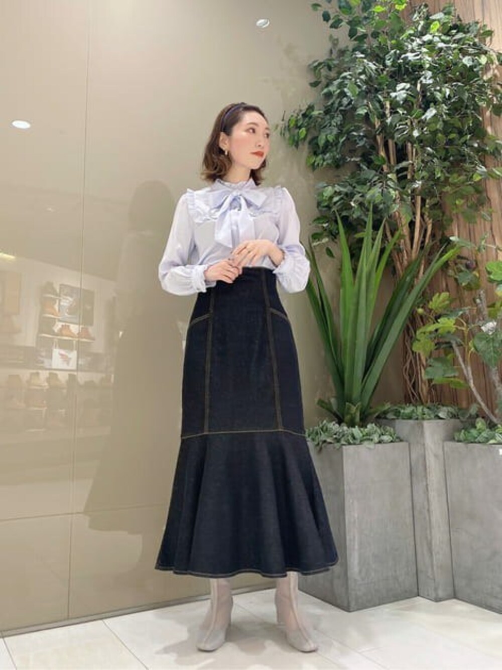【着用サイズ】トップス:M ボトムス:S 【普段サイズ】トップス:S ボトムス:XS~S 大きめのボウタイリボンが今年らしい♡ 細めのストライプ×デニム合わせが爽やかな春コーデです! 胸元のリボンは取り外し可能なので、デイリー使いはもちろんお仕事などきちんとしたシーンにもおすすめの一枚♪ マーメイドスカートはウエスト周りが太めのゴムなので、着心地も良く、ポケット付きの高機能スカート。 シーズンレスで着用も◎