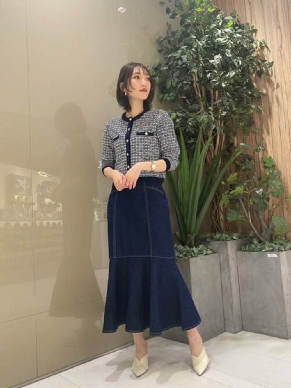 【着用サイズ】トップス:S ボトムス:S 【普段サイズ】トップス:S ボトムス:XS~S 360度どこから見ても美シルエット間違いなし♡ シーズンレスで活躍するダークインディゴのデニムスカートです! 歩くと裾まわりがふんわり広がるので、動きのあるのシルエットが華やかな一枚です◎ ネイビー×ホワイトツイードが春らしい主役級トップスとの合わせなら、トレンド感もあるフェミニンカジュアルな印象に仕上がります♪