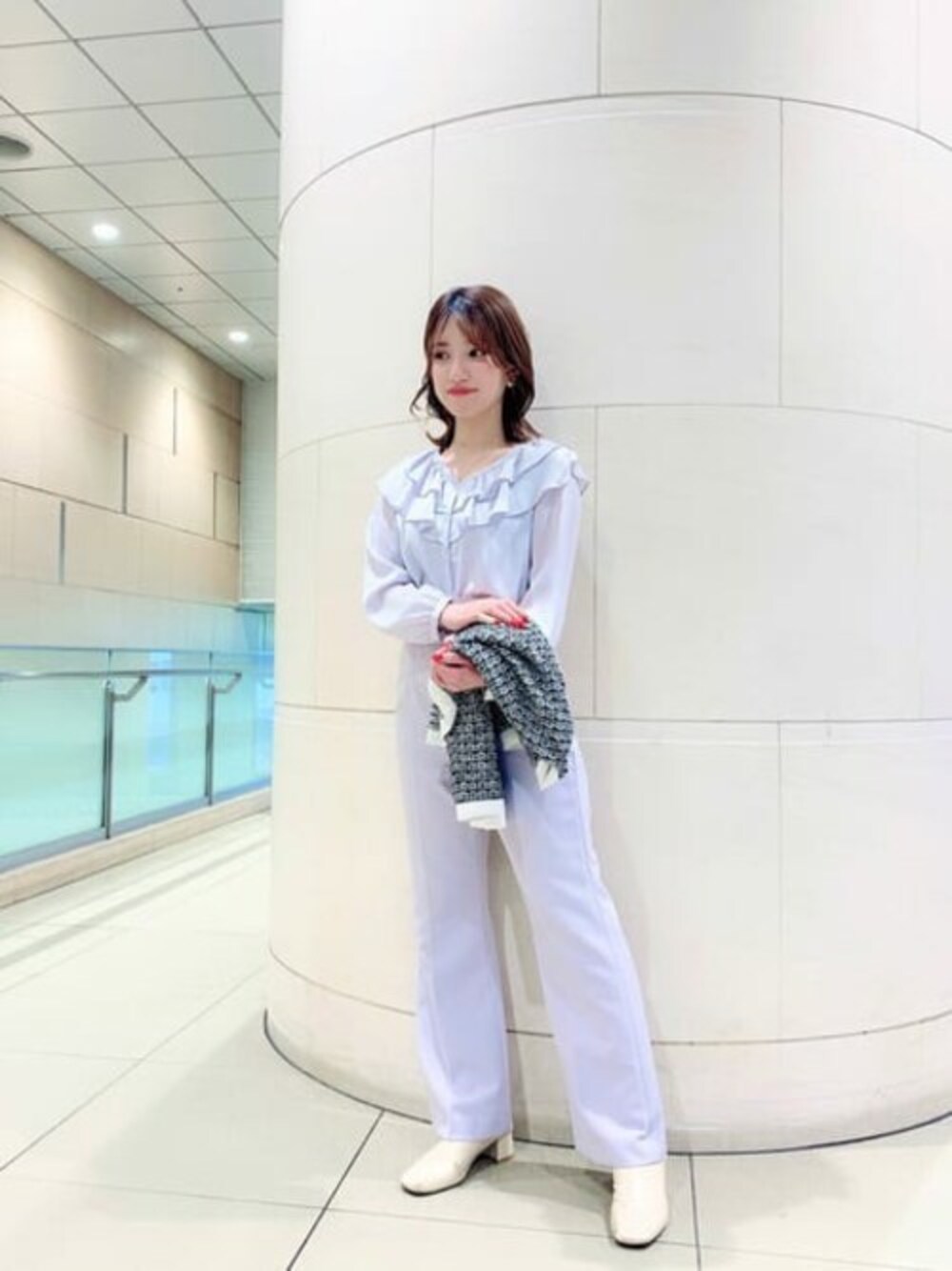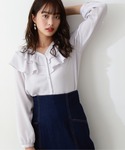 【着用サイズ】トップス:Sボトムス:M 【普段サイズ】トップス:Sボトムス:S〜M 顔まわりのフリルが華やか見えするブラウスです! 首元はVですっきりあいているので、綺麗に見せてくれます。 ボトムスによって、ON OFFどちらでも着回して頂けます!