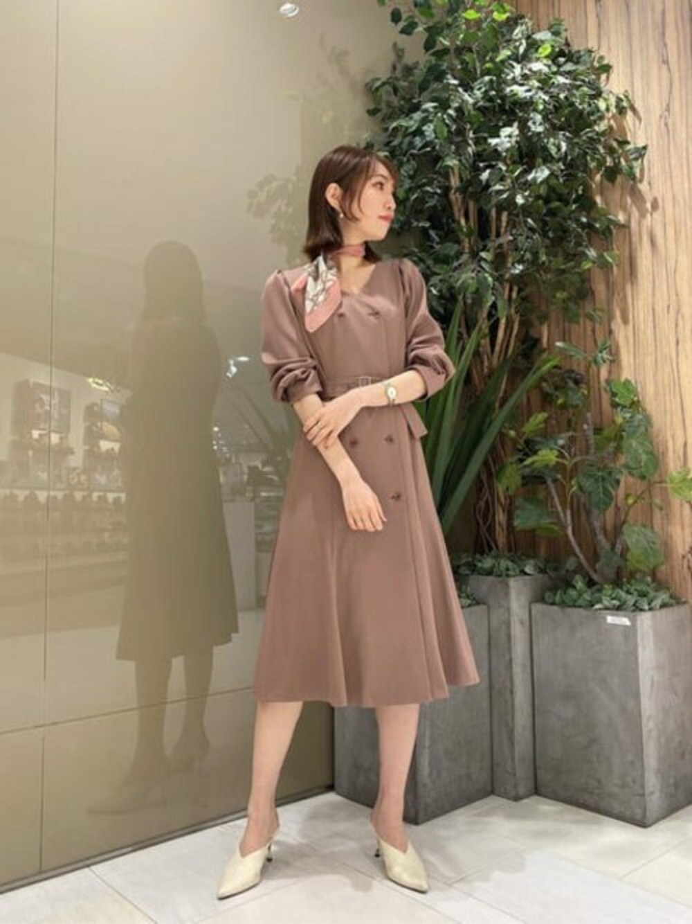 【着用サイズ】ワンピース:S 【普段サイズ】ワンピース:S トレンチ風のデザインが一枚で綺麗めカジュアルな印象に♡ 美シルエットで着映えするVネックワンピースです! ベルトループが後ろに施されているので、共布のベルトを外してもスッキリ着て頂けます! 顔まわりをシャープに見せてくれるVネックデザインなので、シアー素材のスカーフを合わせると、春らしい抜け感のある印象に♪